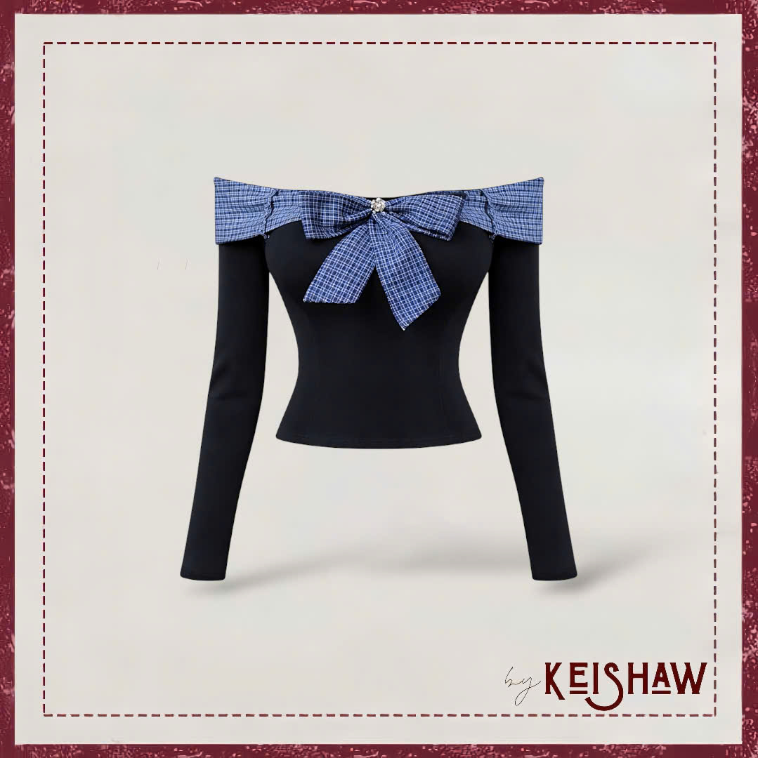 Áo thun dài tay dáng ôm, thiết kế trễ vai sang trọng. Điểm nhấn là chi tiết nơ caro bản to trước ngực, kết hợp đá ngọc nhỏ tạo cảm giác thanh lịch và nữ tính. Chất vải co giãn nhẹ, thoải mái khi mặc, phù hợp đi chơi, hẹn hò hay dự tiệc nhẹ.